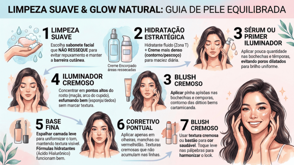 Para quem gosta de praticidade, vale seguir um passo a passo simples, respeitando o tempo de absorção dos produtos e evitando exageros. Em pele madura, menos é mais: camadas muito espessas tendem a marcar rugas e tirar justamente o viço que você quer valorizar.
