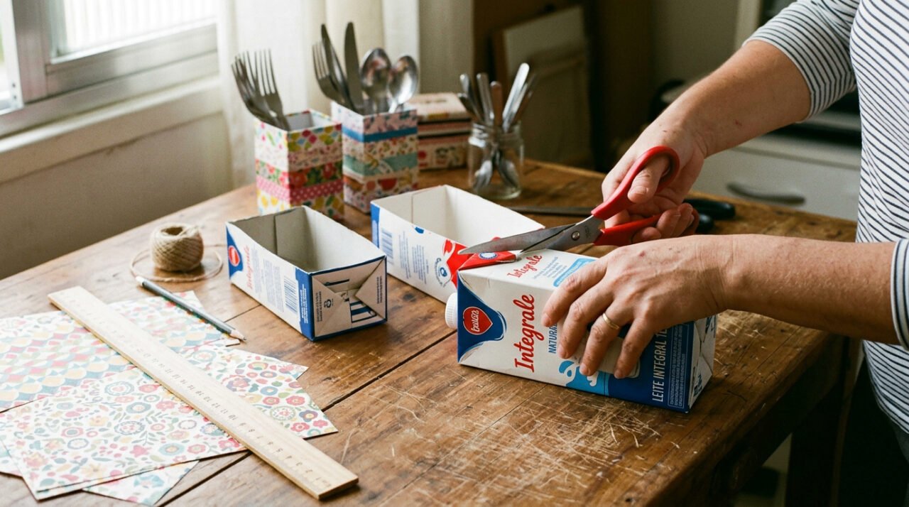 As caixas de leite guardam um potencial criativo que a maioria das pessoas descarta sem perceber. Com um pouco de tesoura, cola e imaginação, esse material tão comum vira um porta-talheres charmoso, funcional e completamente personalizado para a decoração da sua casa. Se você quer renovar a organização da mesa sem gastar nada, essa ideia é exatamente o que você precisa.