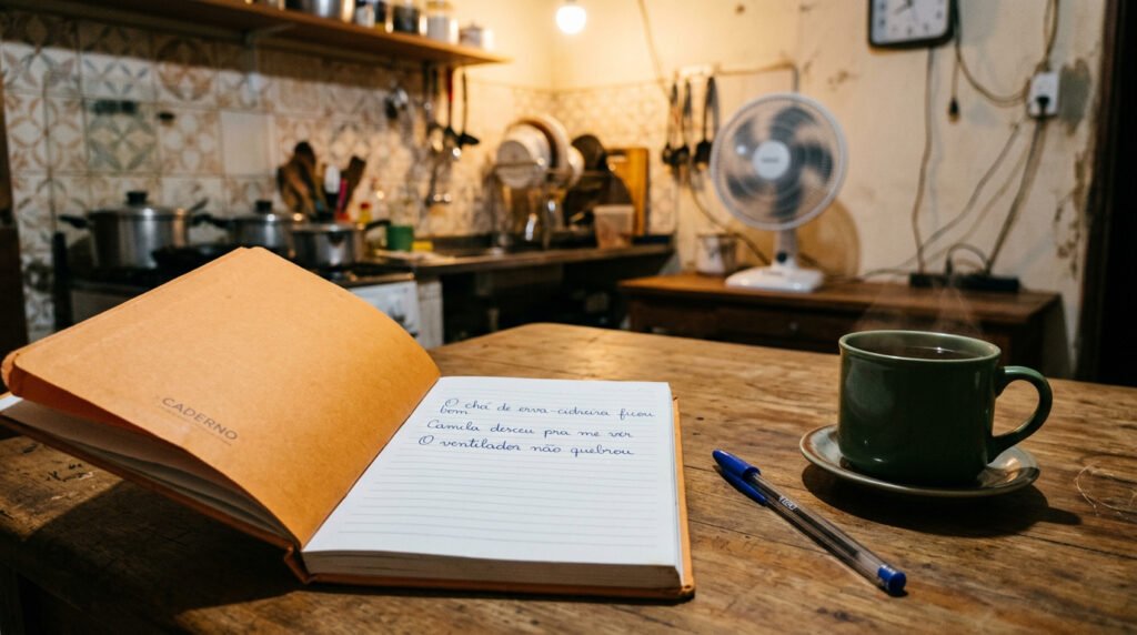 Meia-noite. Vera estava na cozinha, chá já frio na mão, chorando sem saber bem por quê. Camila desceu, viu a mãe e colocou sobre a mesa um caderno de capa laranja.