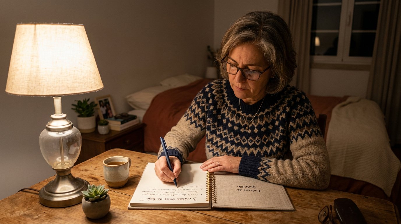 Vera não virou outra pessoa. Continua tendo dias difíceis, notícias ruins, preocupações sem hora. Mas aprendeu a fazer uma pergunta diferente antes de dormir — não “o que deu errado?”, mas “o que aconteceu de bom?”. E o cérebro, que é teimoso mas obediente, foi aprendendo a responder.
