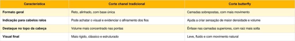 Em vários casos, a transição do chanel para o butterfly é gradual: a parte de trás cresce alguns centímetros além do queixo, enquanto o topo recebe camadas discretas. Assim, a pessoa se acostuma ao novo formato sem ruptura brusca e aproveita o crescimento natural para ajustar o desenho.