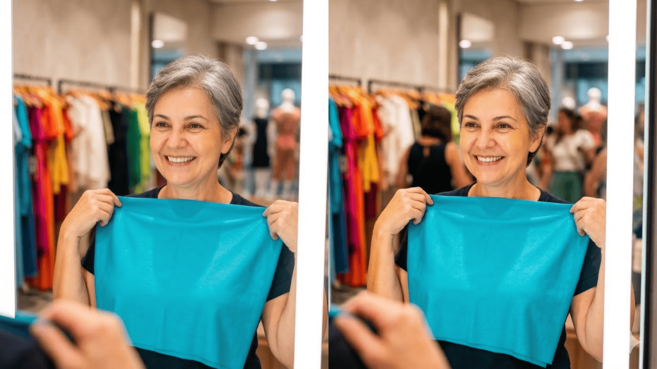 - Comparação direta: experimente duas blusas de cores diferentes, uma de cada vez, e note qual suaviza mais as sombras do rosto inteiro.