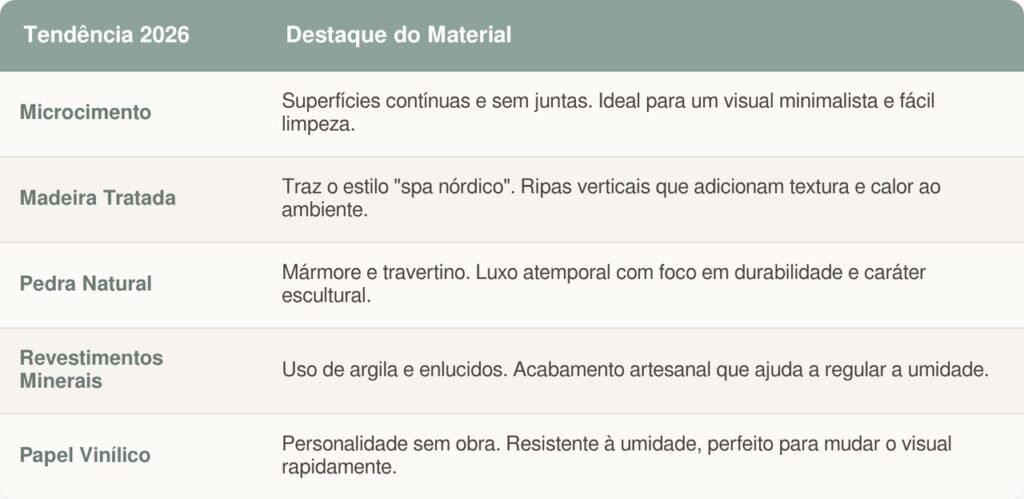 No banheiro moderno em 2026, tintas impermeáveis e revestimentos minerais, como argamassas decorativas e acabamentos com aparência de argila, ganham espaço. Eles criam paredes com textura suave, efeito artesanal e aspecto orgânico, aproximando o ambiente de uma estética natural e acolhedora.
