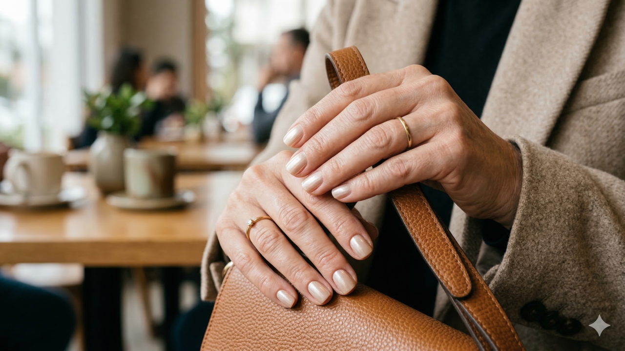 Em peles maduras, tons suaves costumam funcionar melhor do que cores muito escuras ou intensas. Nudes leitosos, rosa claro, creme e branco translúcido alongam visualmente os dedos e iluminam a pele, enquanto cores fechadas podem evidenciar ressecamento e manchas, indo na contramão da proposta de um acabamento mais homogêneo.