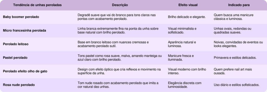 Vários estilos clássicos foram atualizados para aproveitar o efeito perolado, ganhando um ar moderno sem perder a delicadeza. Em salões, modelos como francesinha perolada, degradê suave (“bebê perolado”) e unhas brancas leitosas com reflexo pérola estão entre os favoritos, especialmente para noivas e convidadas de casamento.