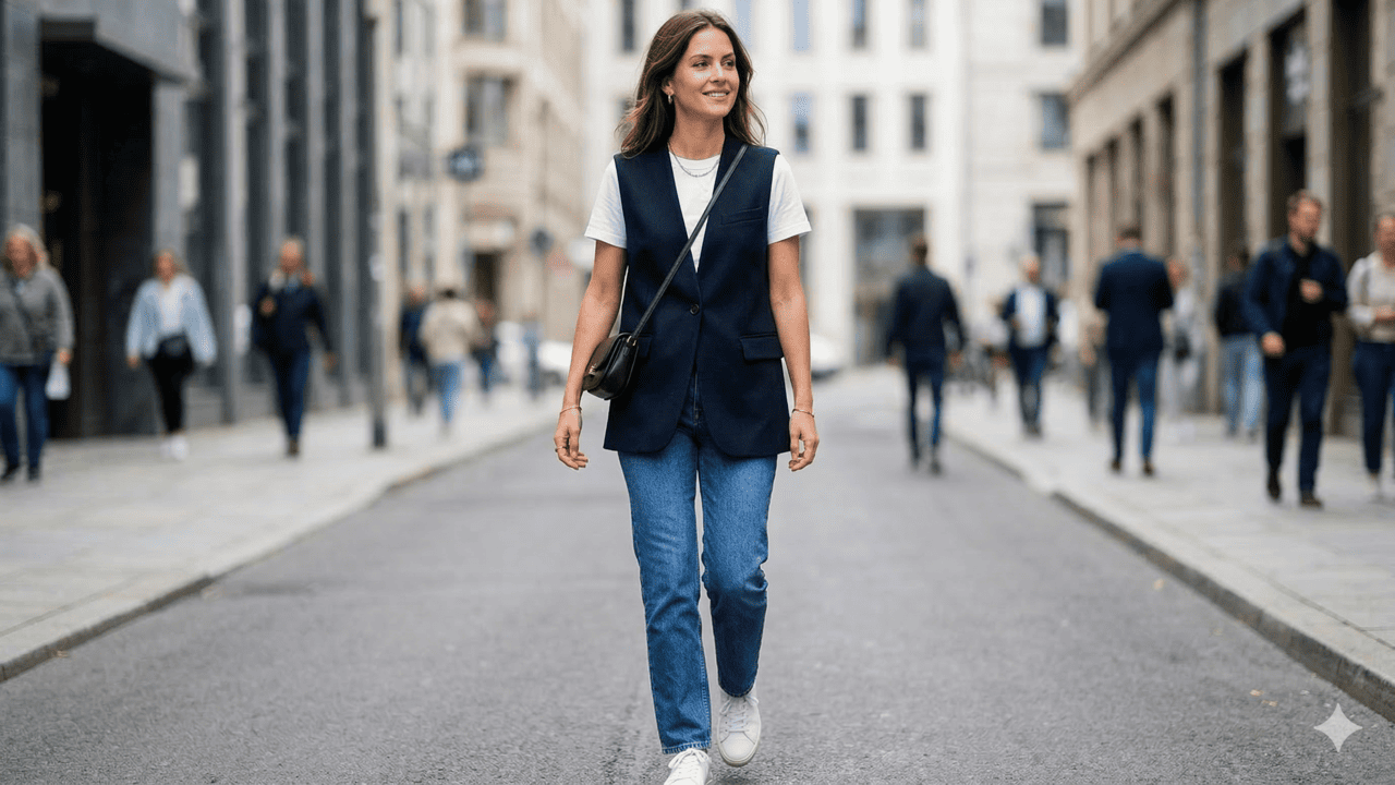 A peça-chave nesse movimento é o colete moderno, que aparece em versões de alfaiataria, tricô, jeans ou tecidos tecnológicos. Ele tem o poder de transformar produções simples em algo mais sofisticado, criando uma camada extra e linhas verticais que ajudam a alongar e valorizar a silhueta feminina.