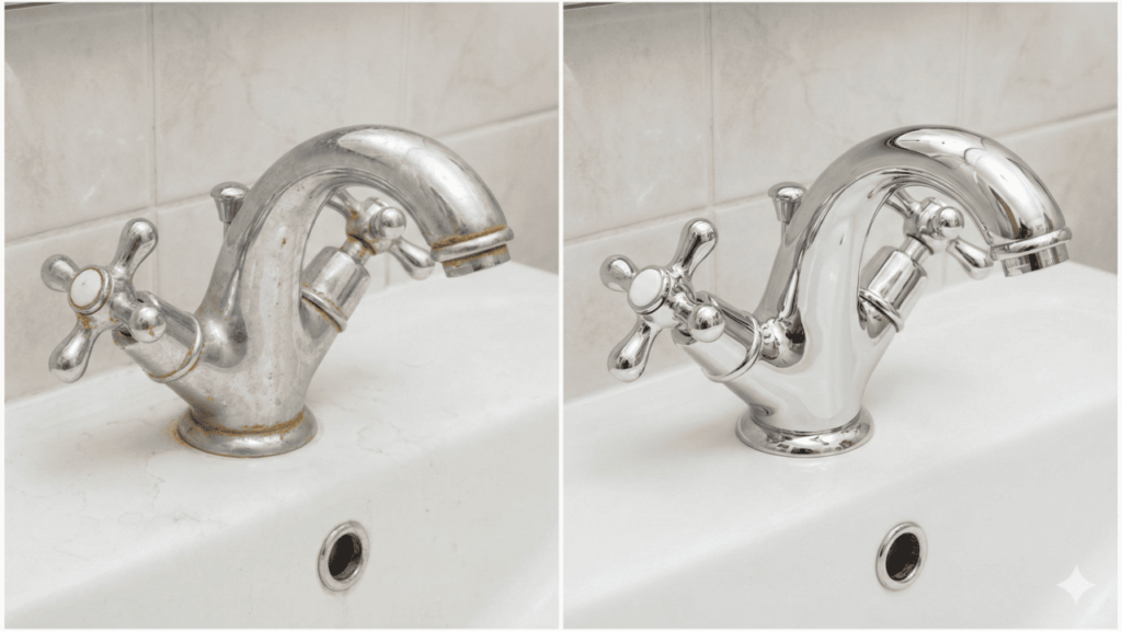 - Nas torneiras: aplicar com pano, borrifador ou papel-toalha embebido, cobrindo toda a parte com calcário.