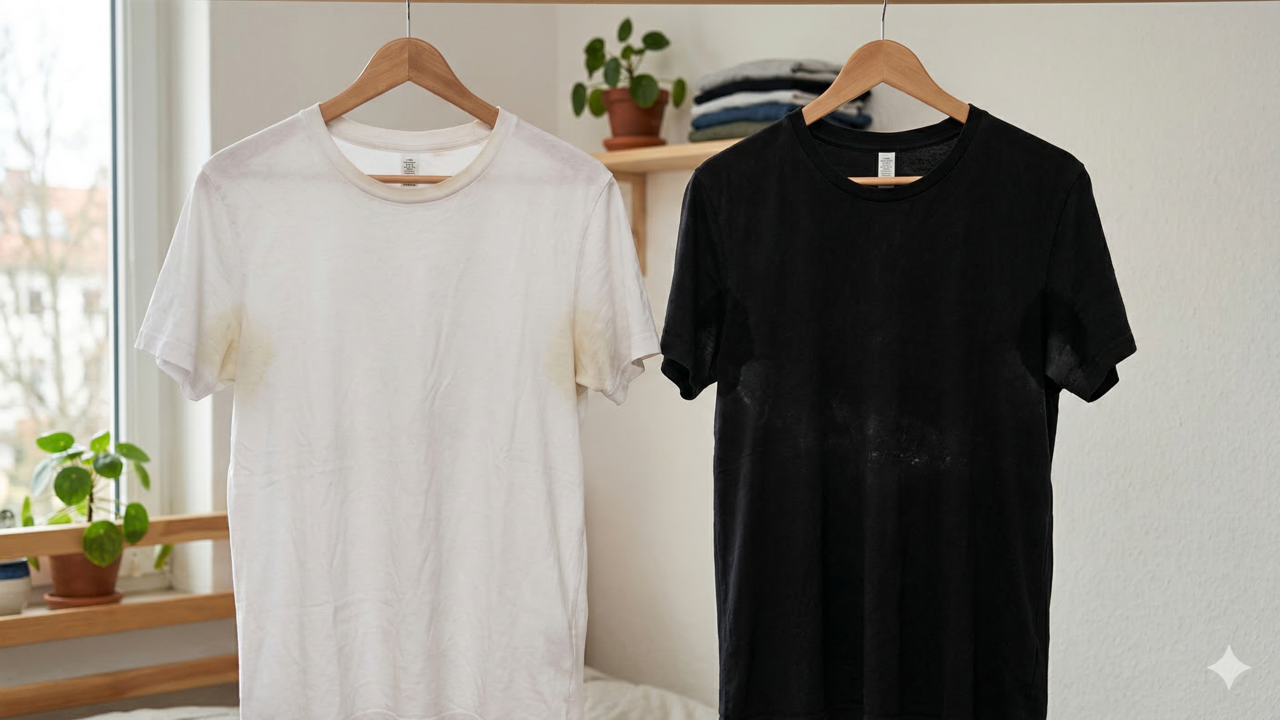 As manchas de transpiração surgem da mistura de suor, sais minerais do corpo e resíduos de desodorante ou antitranspirante. Com o tempo, essa combinação pode endurecer o tecido ou alterar a cor, principalmente em regiões de axila, gola e costas.