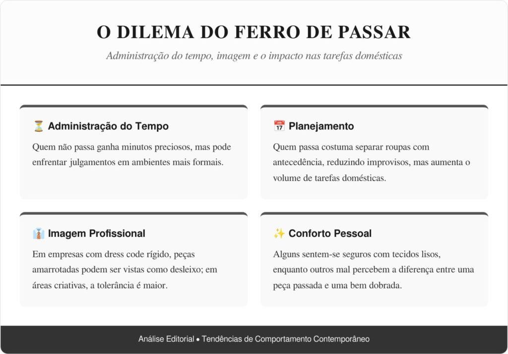 Esse detalhe aparentemente simples mexe com a gestão do tempo, com a sensação de controle da casa e até com a confiança em ambientes sociais. Dependendo do contexto, a mesma camisa amarrotada pode ser vista como atitude descolada ou como falta de cuidado, o que influencia escolhas diárias e até oportunidades profissionais.