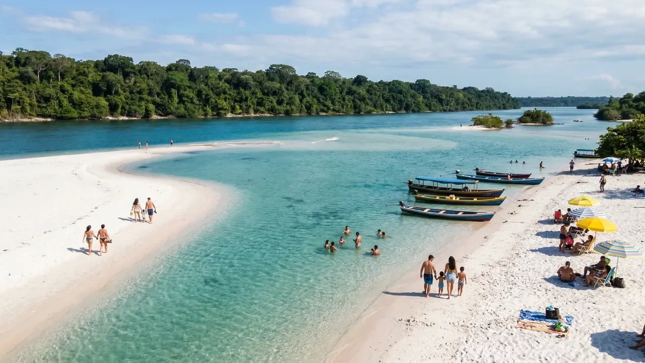 Alter do Chão entrega algo que nenhum litoral consegue: praias de areia branca cercadas pela maior floresta tropical do planeta, com águas mornas e cristalinas que mudam de cenário conforme a estação. Na seca, o Tapajós revela bancos de areia dignos do Caribe. Na cheia, a mesma água invade a mata e cria corredores navegáveis entre copas de árvores.