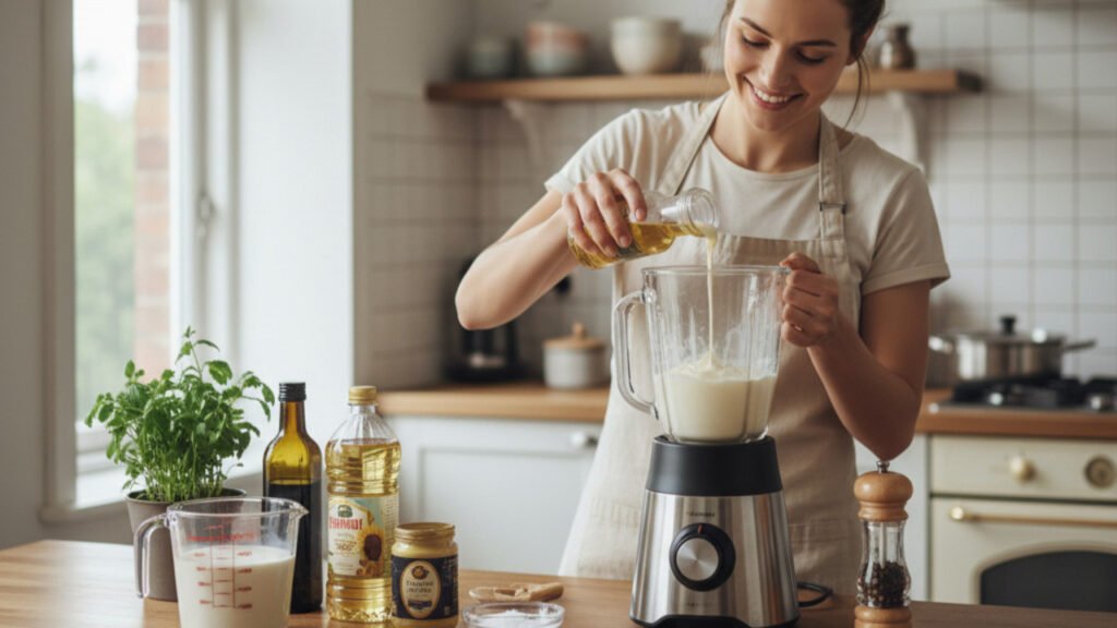 - Incorporar o restante do óleo: movimente o mixer suavemente para cima e para baixo, envolvendo o óleo que ficou na superfície.
