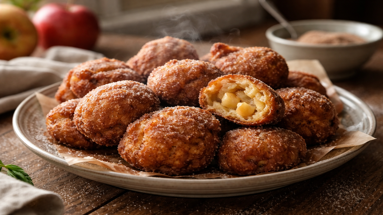 Bolinhos de maçã são pequenos bolos fritos, macios por dentro e levemente crocantes por fora, preparados com uma massa simples enriquecida com pedaços de fruta. A textura lembra um bolo mais espesso colocado em porções no óleo quente, resultando em um doce de doçura moderada que combina bem com açúcar e canela.