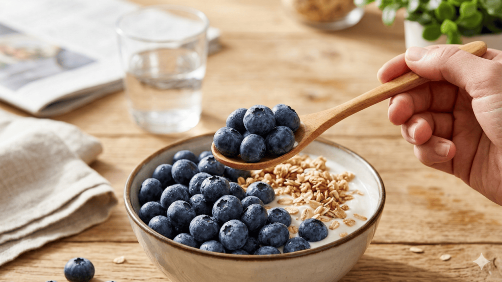 A presença do mirtilo na alimentação pode ocorrer na forma in natura, congelada, desidratada ou em preparações simples do dia a dia. Por ter sabor levemente adocicado e textura macia, a fruta combina bem com lanches rápidos, cafés da manhã e até sobremesas mais leves, sem exigir grandes mudanças na rotina.