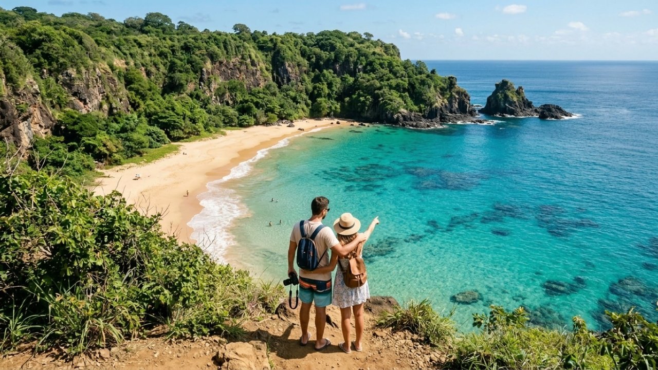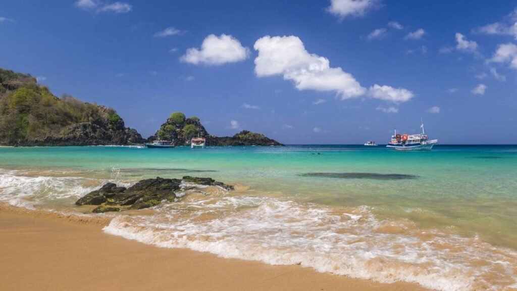 A Baía do Sancho não oferece conforto de resort nem música ambiente. O que ela entrega é um cenário de falésias verdes, areia dourada e um mar tão transparente que tartarugas e cardumes aparecem a olho nu. É o tipo de praia que justifica cada degrau da descida e cada taxa de preservação paga na chegada.