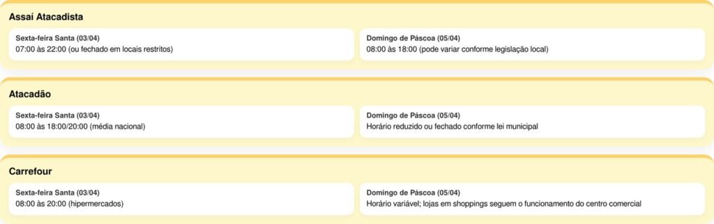 O Assaí Atacadista tende a operar na Sexta-feira Santa em horário reduzido, com muitas lojas abrindo entre 7h e 8h e encerrando por volta de 22h, mas algumas unidades podem não abrir em cidades com regras mais rígidas. O Atacadão costuma atender entre 8h e 18h ou 20h, enquanto o Carrefour, especialmente em formato hipermercado, opera em faixa aproximada das 8h às 20h, com lojas de shopping seguindo o horário do centro comercial.
