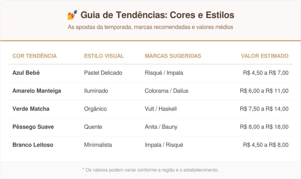 As cores de esmalte em tons de azul bebê estão fazendo um sucesso absoluto por transmitirem muita calma e elegância. Essa tonalidade pastel combina perfeitamente com acessórios prateados e traz uma modernidade sutil para o dia a dia. Muitas mulheres preferem essa opção para fugir dos tradicionais tons escuros sem perder a classe necessária em eventos sociais.