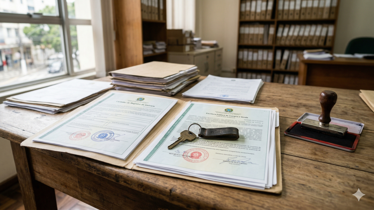 O processo normalmente começa no Tabelionato de Notas, com a lavratura de instrumentos preparatórios, como a ata notarial, e termina no Cartório de Registro de Imóveis, onde será feito o registro definitivo. A documentação varia conforme o caso, mas alguns documentos são praticamente indispensáveis.