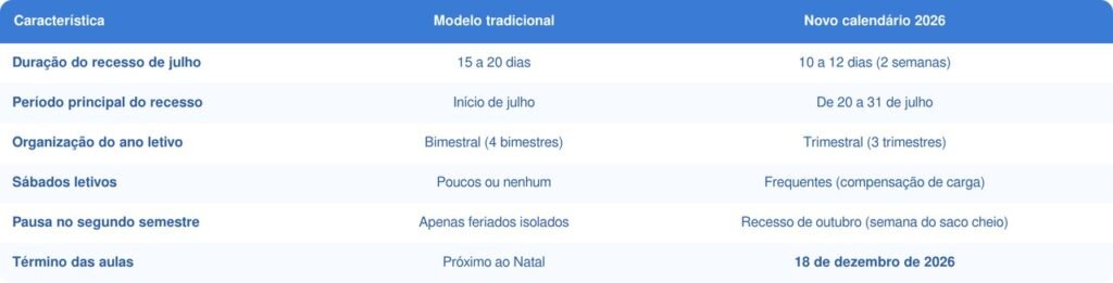 - Término das aulas antes do fim de dezembro, garantindo férias finais mais bem definidas.