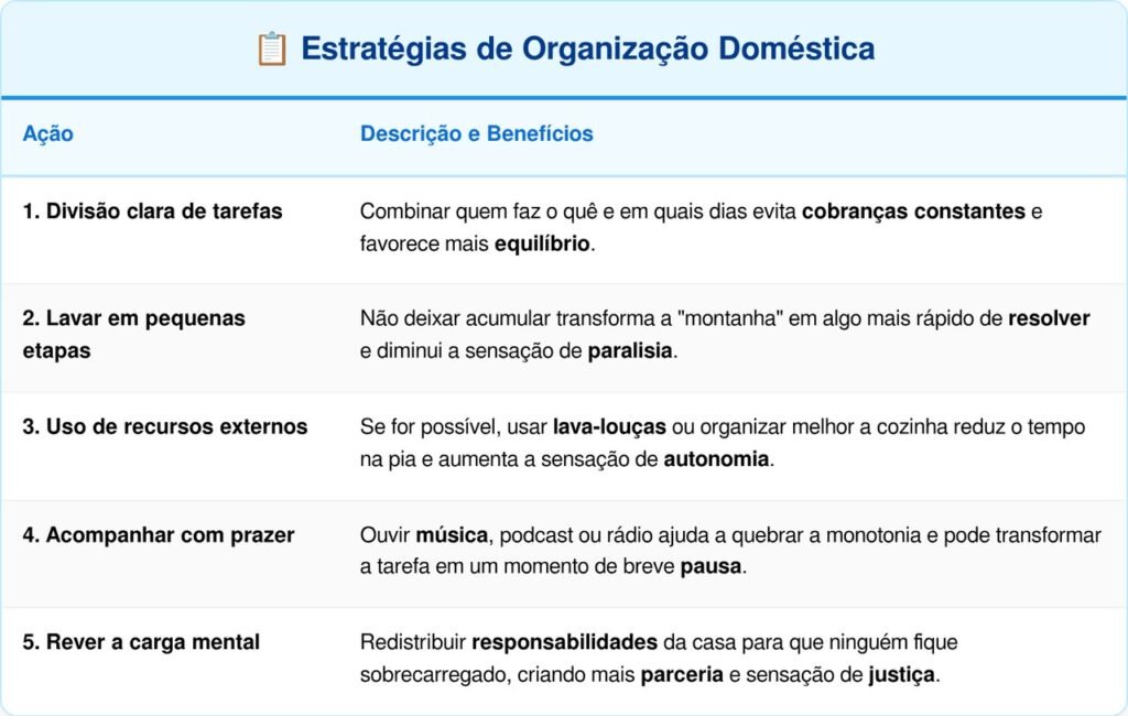 Esse desconforto costuma estar ligado à chamada “carga mentalhorários, planejar o que cada um vai fazer. A louça, nesse contexto, é apenas a parte visível de uma lista enorme de responsabilidades que cansam a mente.
