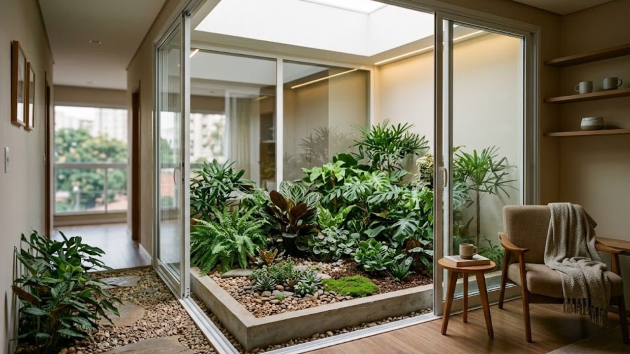Esse jardim pode ser bem simples, com alguns vasos bem escolhidos, ou mais elaborado, com canteiros rebaixados, pedriscos e substrato aparente. Em apartamentos, é comum usar nichos, estantes e jardins verticais para levar o verde para dentro sem roubar muito espaço, mantendo o ambiente agradável o ano todo.
