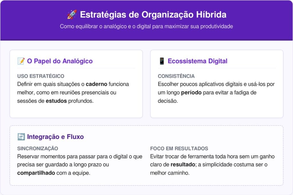 Na vida real, muitas pessoas não veem caderno e aplicativos como rivais, e sim como aliados. Em geral, o papel fica para momentos de foco profundo, brainstorming e estudos; o digital entra quando é preciso buscar rápido, compartilhar com outras pessoas ou acessar o conteúdo em vários dispositivos.