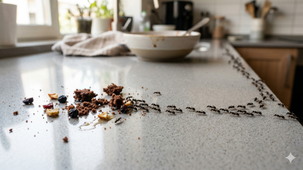 Em apartamentos e casas térreas, também vale observar áreas perto de caixas de gordura, pontos de água, atrás de fogões e geladeiras, onde restos de alimentos podem se acumular e atrair novas trilhas de formigas.