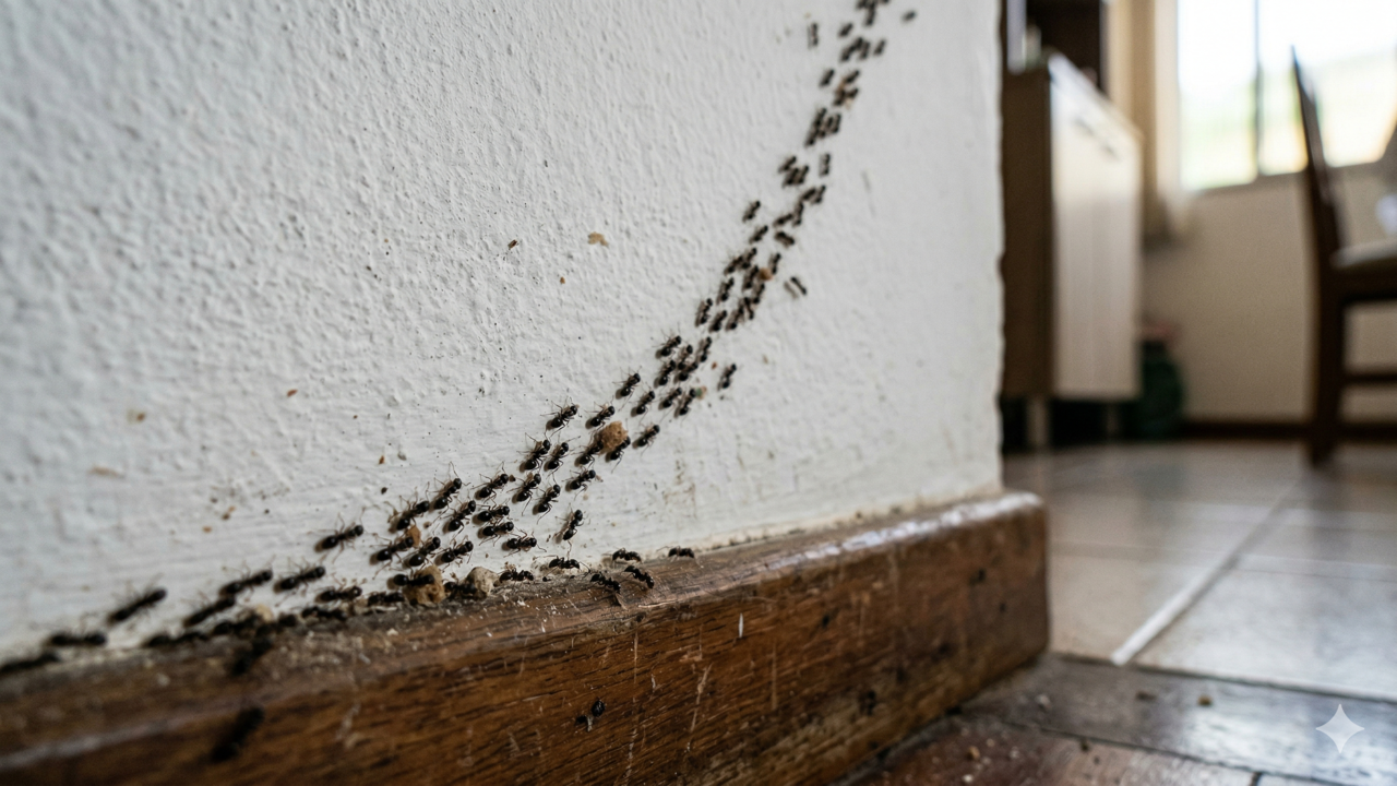 - Rodapés e quinas de parede: pulverizar ao longo das bordas, especialmente onde se notam linhas de formigas passando.