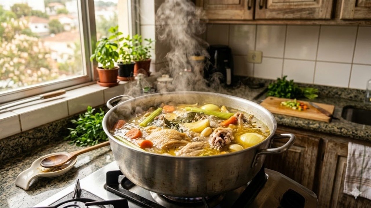 O caldo de frango caseiro é um líquido aromático obtido a partir do cozimento prolongado de frango com legumes e temperos. Ele funciona como base culinária em diversas receitas, substituindo a água simples e agregando sabor sem precisar de muitos condimentos adicionais.