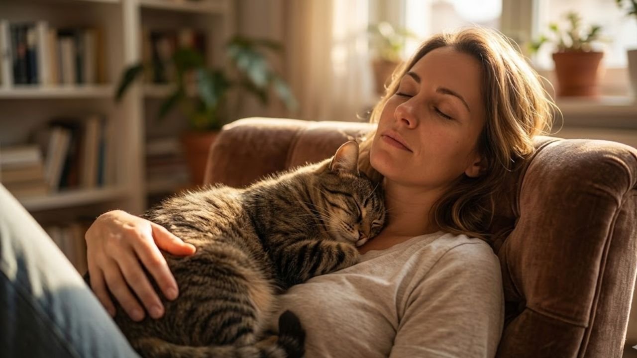 Estudos sobre convivência com animais de estimação indicam que gestos de proximidade, como o gato que dorme no peito, estão associados a menor percepção de estresse e maior sensação de companhia. O contato físico leve e o som do ronronar podem deixar o ambiente doméstico mais calmo e acolhedor.