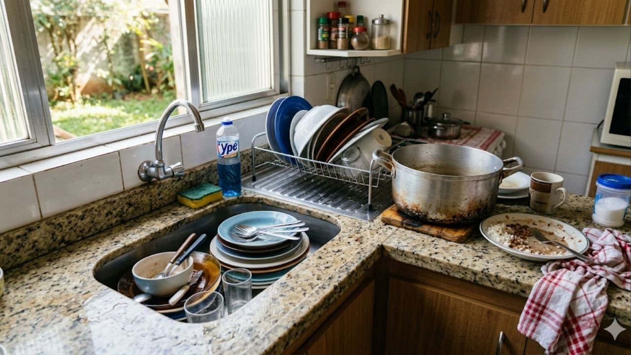 Na rotina real, isso costuma surgir depois de um dia corrido, discussões em casa, sobrecarga com filhos, trabalho acumulado ou sensação de que tudo depende da mesma pessoa. A pia cheia passa a representar mais do que pratos e copos. Ela carrega exaustão, irritação, pressa e, às vezes, uma vontade enorme de simplesmente parar.