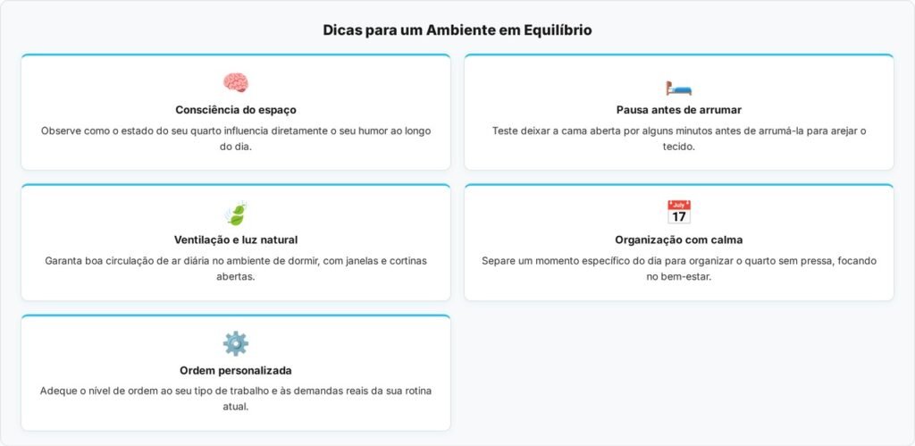 Para simplificar esse processo, vale transformar a arrumação da cama em um pequeno ritual, ajustado ao seu estilo de vida. Algumas atitudes práticas podem ajudar a criar uma rotina mais leve e saudável sem gerar culpa ou excesso de cobrança interna.
