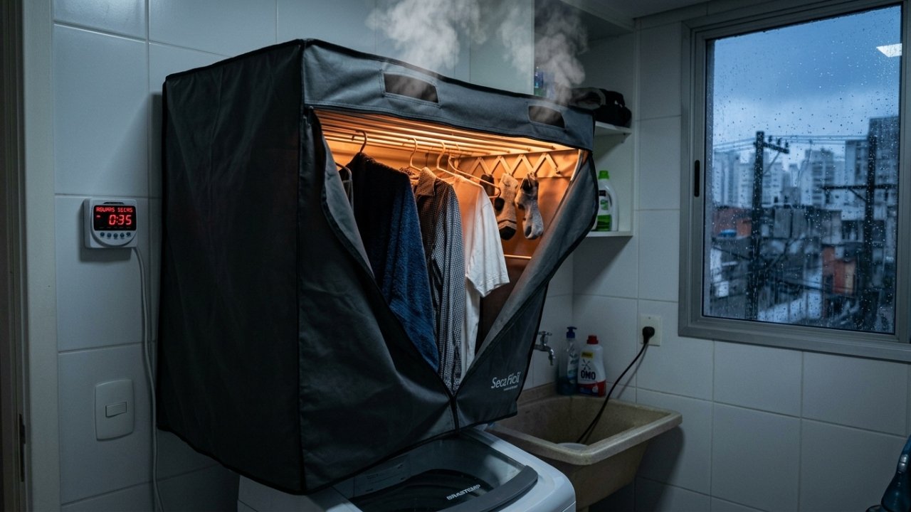 Para aumentar a eficiência, o sistema de aquecimento costuma ter potência em torno de 1 kW, com o calor percorrendo o interior da capa térmica, que reduz perdas para o ambiente. Assim, peças grossas, como jeans e toalhas, secam em bem menos tempo que em um varal dentro de um cômodo fechado, com consumo de energia geralmente menor que o de uma secadora de tambor.