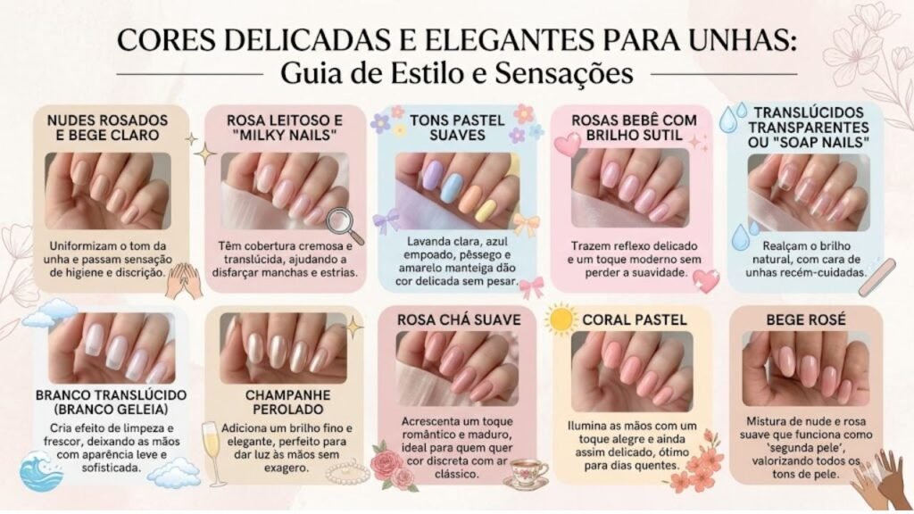 A expressão cores de unhas que trazem frescor, luz e elegância resume bem o que muitas mulheres maduras buscam: naturalidade com um toque chique. Nudes, rosados suaves, leitosos e pastéis claros costumam ser os favoritos de manicures e especialistas em beleza para esse efeito.