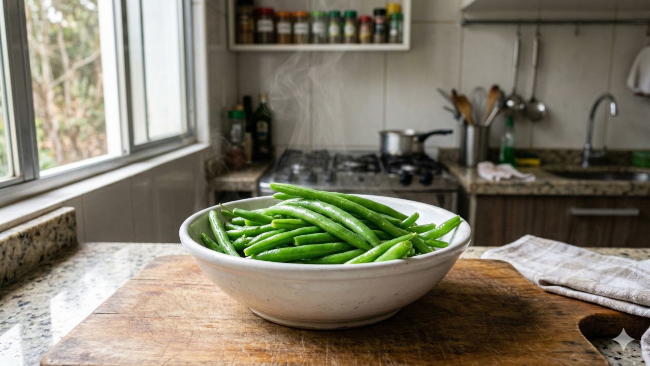 A quantidade de água e a intensidade da fervura também influenciam muito. Em panelas com pouco líquido ou fogo baixo, o aquecimento é irregular e as vagens demoram a atingir a temperatura ideal, fazendo muitas pessoas prolongarem o cozimento além do necessário e comprometendo cor, sabor e textura.