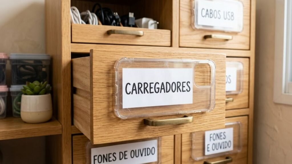 Além da saboneteira e das etiquetas para gavetas, a reutilização de capas de telefone abre espaço para muitas outras ideias simples e úteis. Alguns modelos podem virar mini-bandejas para chaves e moedas perto da porta de entrada, suporte para pequenos frascos em penteadeiras ou base de proteção para pés de móveis pesados, evitando riscos em mesas e prateleiras delicadas.