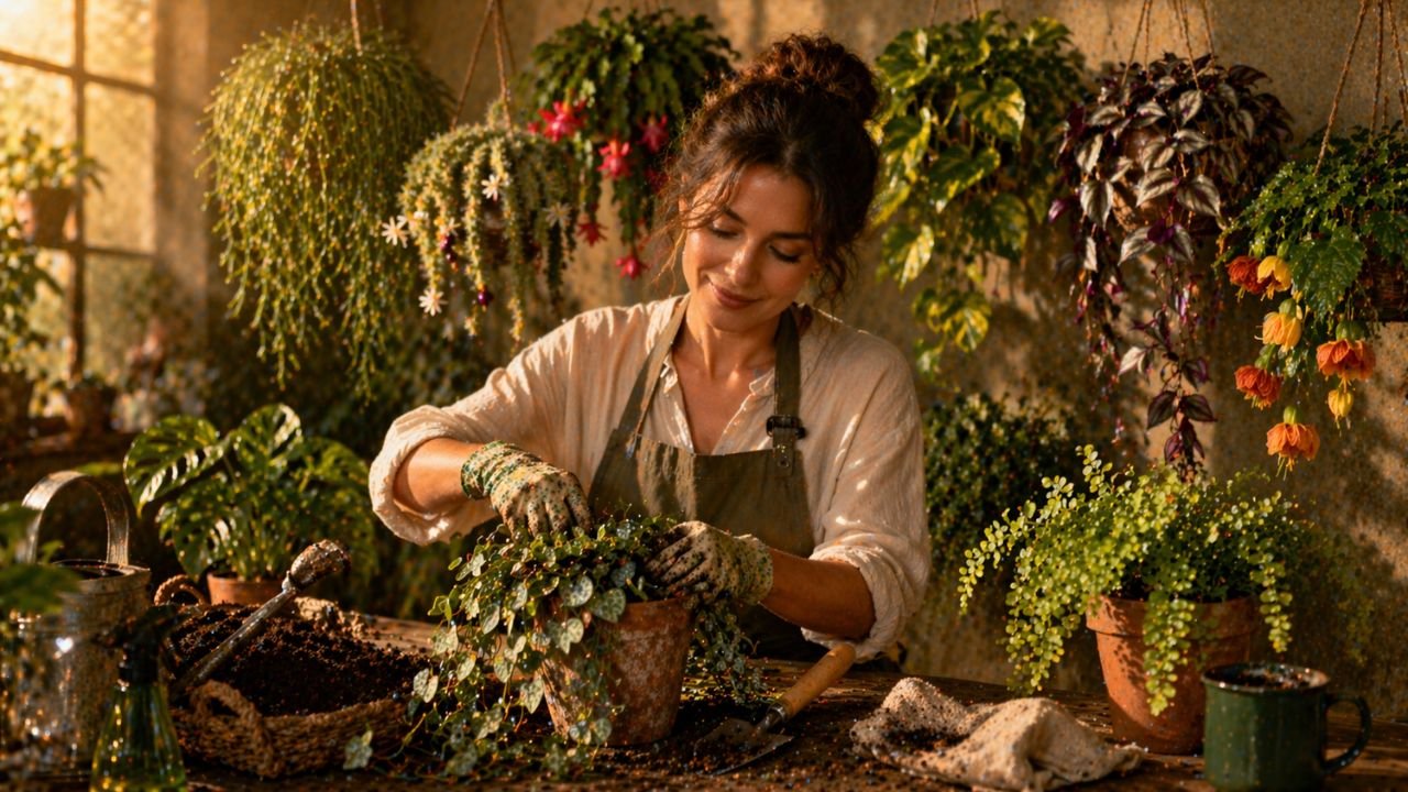 A monstera adansonii, registrada na flora brasileira, combina o visual de trepadeira com uso pendente, exibindo folhas perfuradas que podem cair livremente de vasos altos ou ser conduzidas em suportes. Já o abutilon, ou lanterninha, oferece campânulas pendentes em cores vivas, que se destacam em varandas ensolaradas, janelas amplas e jardineiras suspensas, com floração abundante em condições adequadas de luz e rega.