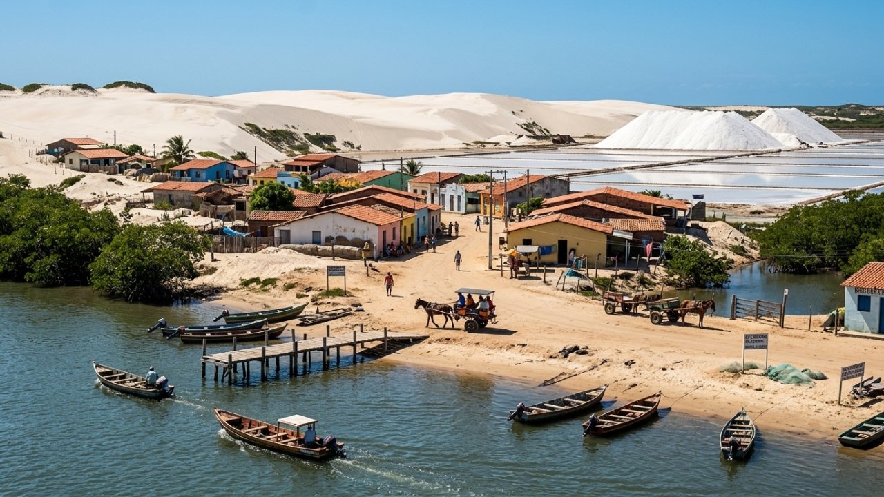A 160 km da capital, o vilarejo sem asfalto, acessível só por barco, onde 2.100 moradores vivem entre dunas brancas e montanhas de sal