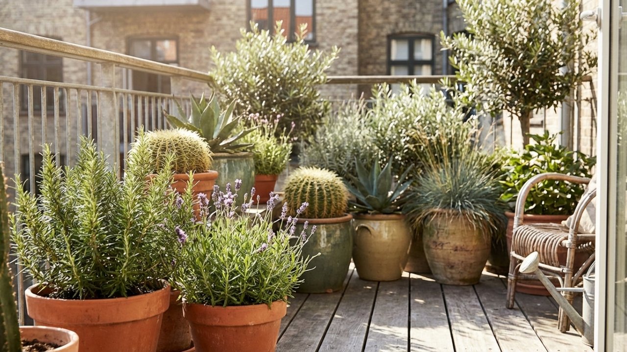 Espécies resilientes como lavanda e alecrim suportam sol e vento em varandas