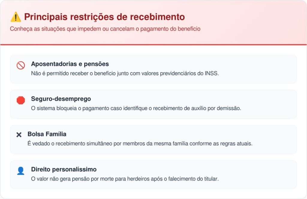 A natureza assistencial do programa impede o acúmulo com outros seguros governamentais. Confira as principais restrições de recebimento: