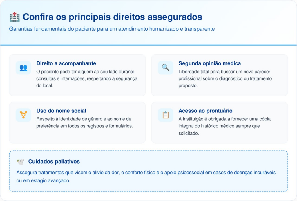 A nova lei consolida uma série de proteções para quem busca assistência médica, garantindo que o paciente seja tratado com dignidade, sem qualquer forma de preconceito ou discriminação. Seja por origem, religião, gênero ou condição social, o respeito passa a ser um pilar obrigatório e fiscalizável em todas as unidades de saúde.