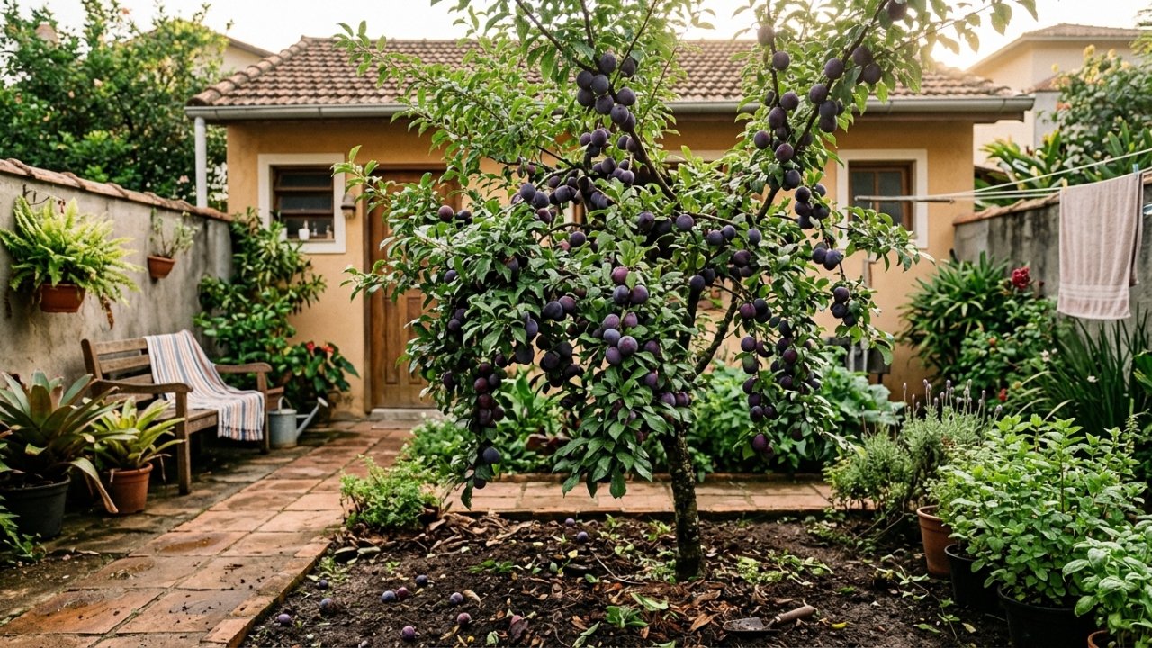 Ameixeira une porte compacto e raízes seguras garantindo sombra e frutos em quintais pequenos