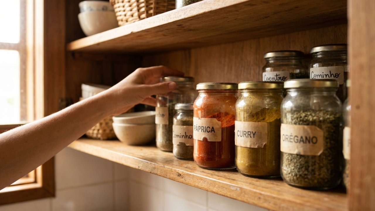 Quando possível, optar por grãos inteiros, como pimenta-do-reino, cominho ou coentro, também ajuda. Eles preservam o sabor por mais tempo e liberam o aroma na hora, reduzindo perdas e garantindo temperos sempre frescos.