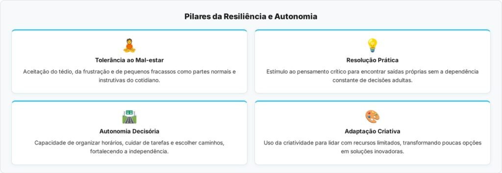 Essa resiliência envolve tolerar frustrações, ser mentalmente flexível, conseguir regular o que se sente e tirar algum aprendizado das experiências desafiadoras. É como um músculo interno: quanto mais usado e treinado, mais forte fica para enfrentar situações inesperadas.