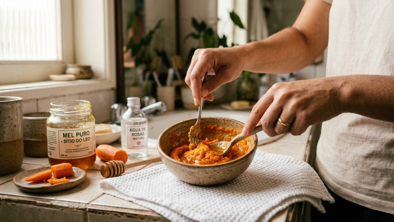 Para preparar essa mistura potente você precisa primeiro cozinhar uma cenoura média até que ela fique bem macia para conseguir amassar com um garfo. Espere o vegetal esfriar totalmente em temperatura ambiente para não causar nenhuma queimadura ou irritação boba na sua pele sensível. Adicione uma colher bem generosa de mel puro de qualidade para criar uma pasta homogênea e muito fácil de espalhar pelo rosto limpo.