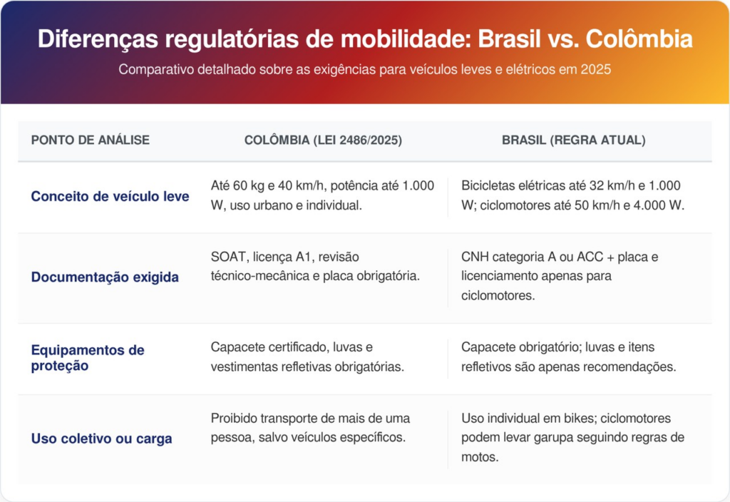 No Brasil, o tema é regido pela Resolução CONTRAN nº 996/2023. Diferente da lei colombiana, que foca no peso e na velocidade operacional, a norma brasileira foca na velocidade máxima de fabricação. Bicicletas elétricas no Brasil são limitadas a 32 km/h para permanecerem isentas de CNH e placa.