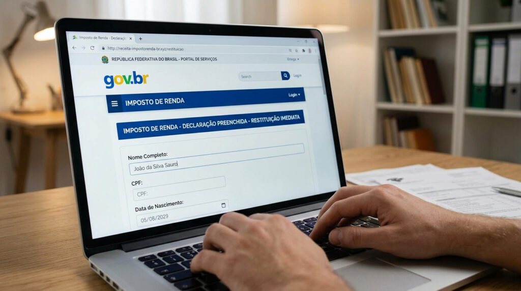 A mensagem inclui um link que direciona para uma página falsa, cuidadosamente construída para imitar o ambiente oficial do governo. Nessa página fraudulenta, o contribuinte é induzido a informar dados pessoais e bancários ou a realizar pagamentos indevidos. A sofisticação dessas fraudes aumentou consideravelmente em relação aos anos anteriores, tornando a identificação mais difícil para quem não conhece os sinais de alerta.