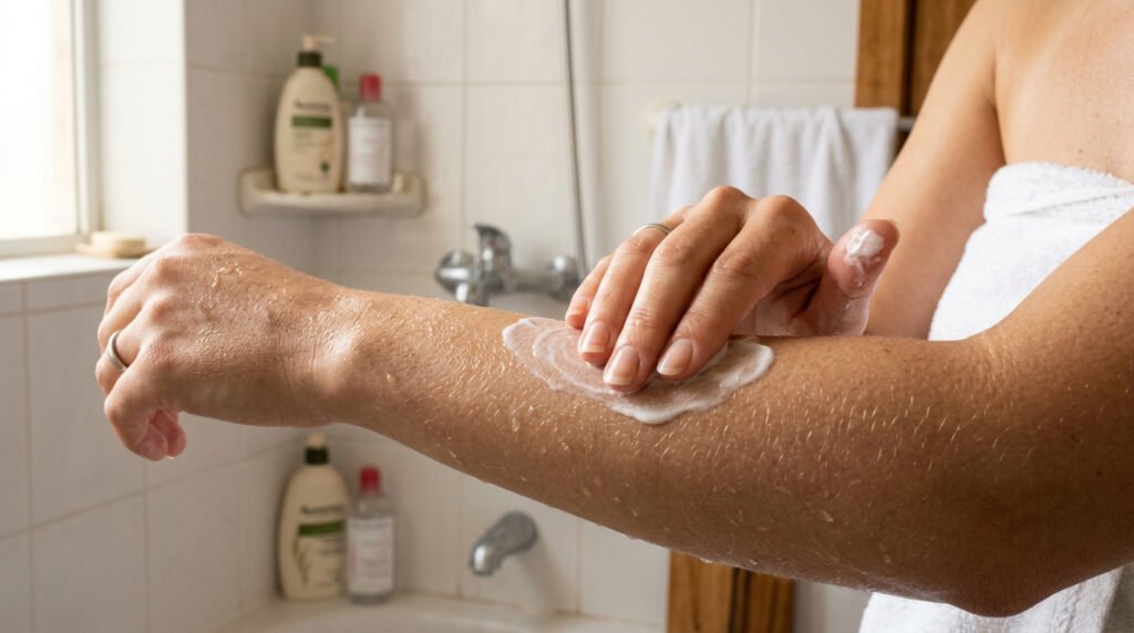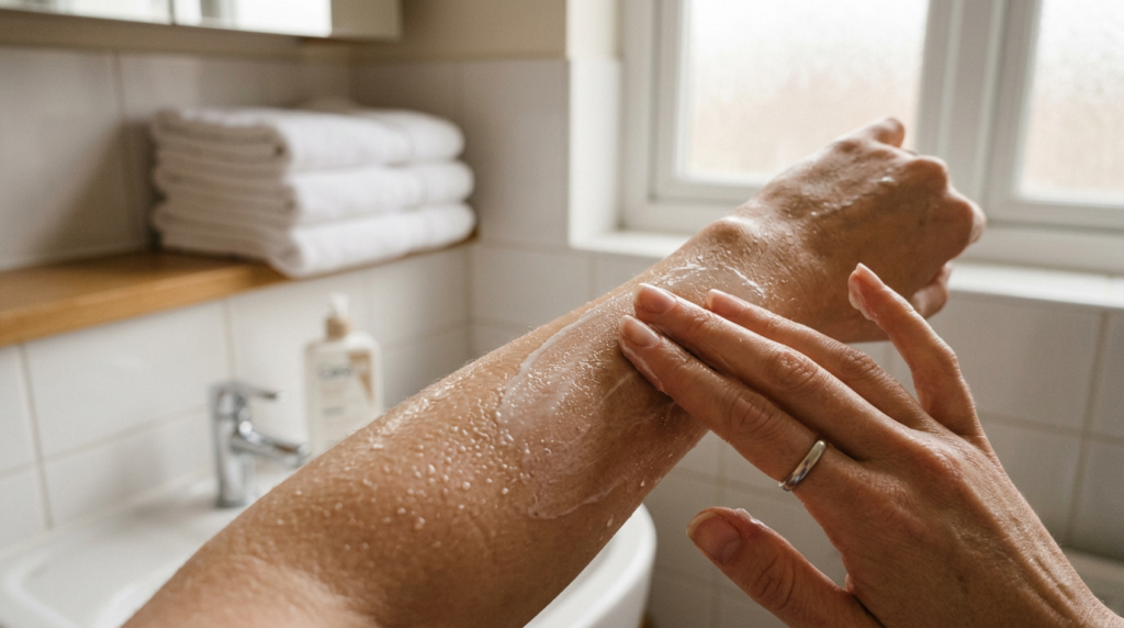 - O hidratante deve ser aplicado logo após o banho, com a pele ainda úmida, para selar a barreira cutânea.