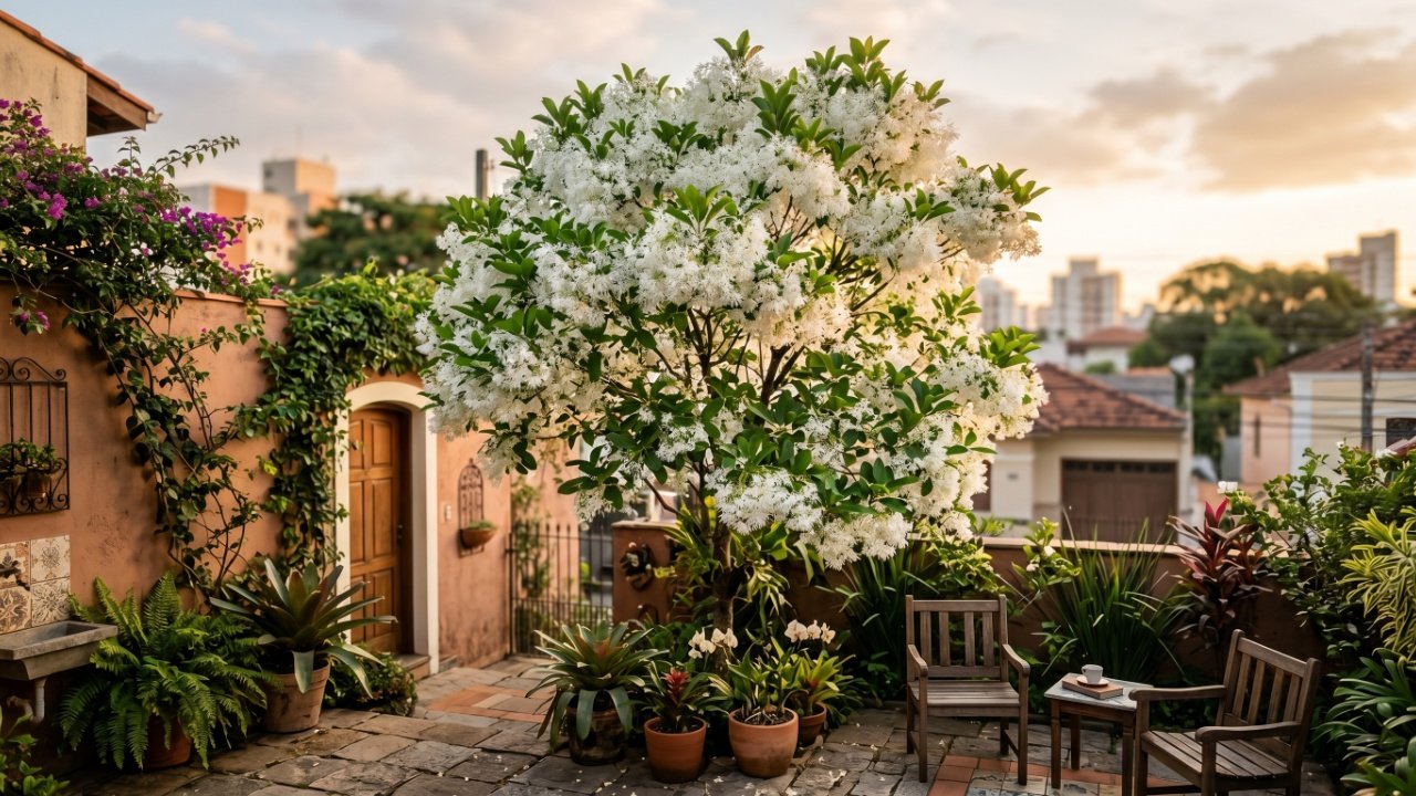 A árvore de flores brancas que cria um espetáculo visual e perfuma todo o quintal