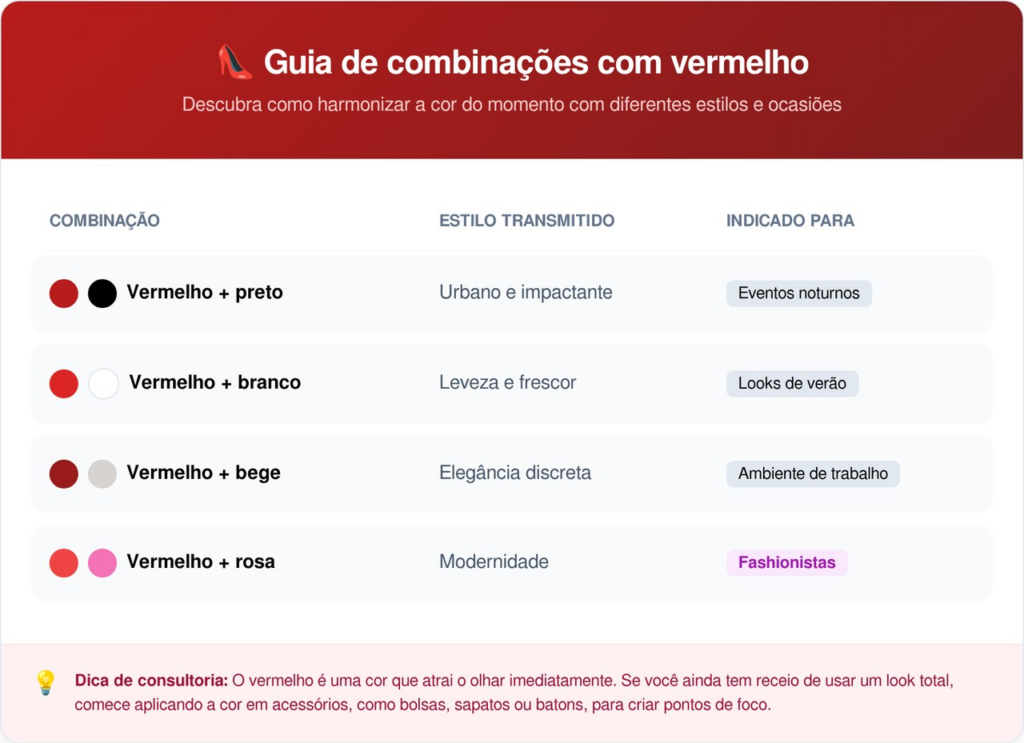 A montagem de um look equilibrado depende da interação entre o vermelho e as tonalidades complementares escolhidas. Enquanto duplas neutras garantem sobriedade, a mistura com cores análogas cria visuais modernos e cheios de atitude fashionista.