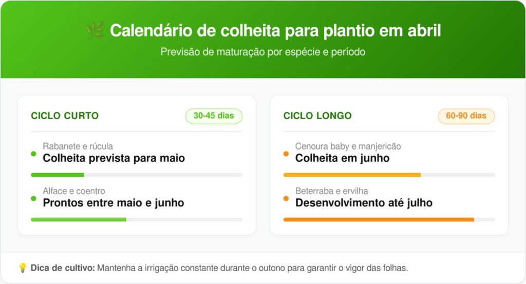 Planejar o que será plantado no outono exige atenção aos prazos de desenvolvimento de cada semente. Ao semear em abril, você cria uma janela de colheita que se estende de maio até julho, dependendo da espécie escolhida para o canteiro.